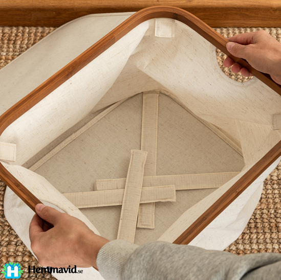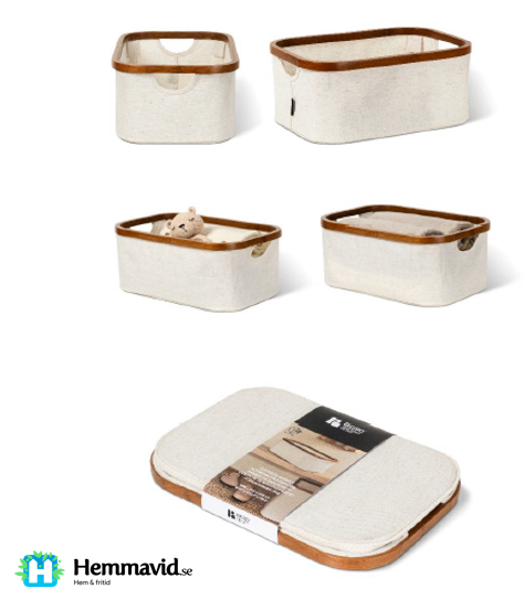 Upptäck vår nya förvaringslinje i bambu och linne. Designad med rena linjer och mjuka material, ger sortimentet lugn, ordning och skönhet till varje rum i ditt hem. En hållbar bamburam i varma bruna toner i kombination med linnefärgat tyg och dess naturliga trådvariationer.