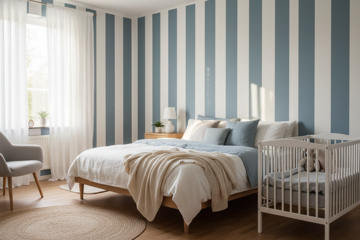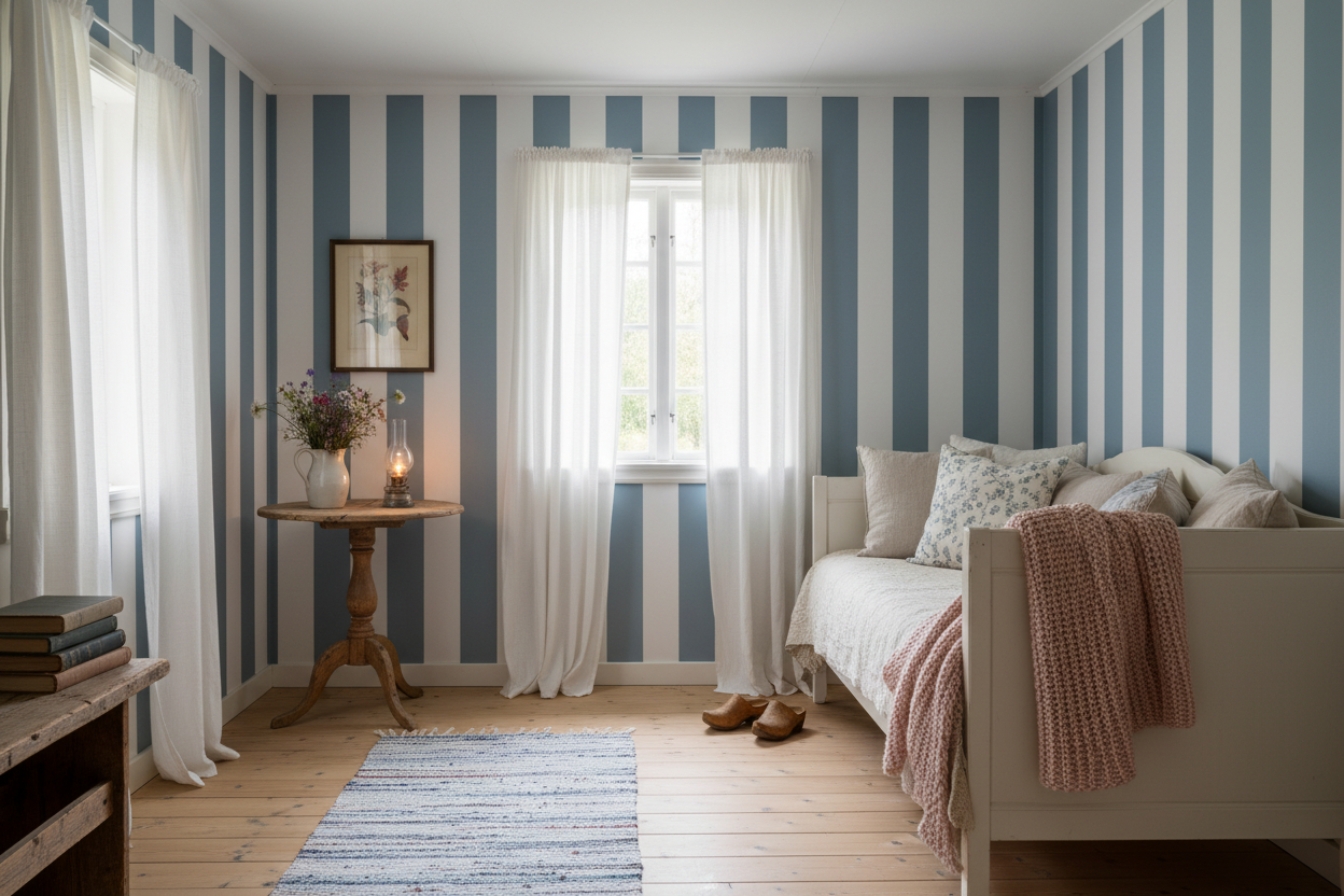 Om du vill ha en mer avslappnad och lekfull stil kan du välja att sätta tapeten vågrätt och kombinera den med moderna möbler och tillbehör i djärva färger. På så sätt kan du skapa en färgglad och personlig atmosfär i rummet.