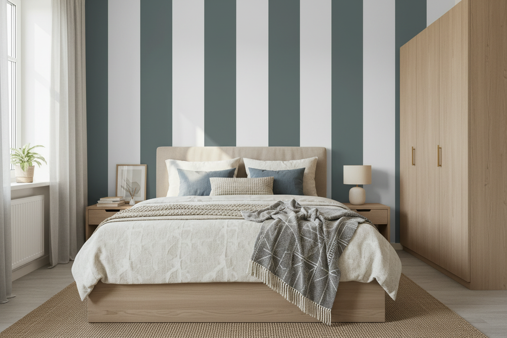 Om du vill ha en mer avslappnad och lekfull stil kan du välja att sätta tapeten vågrätt och kombinera den med moderna möbler och tillbehör i djärva färger. På så sätt kan du skapa en färgglad och personlig atmosfär i rummet.