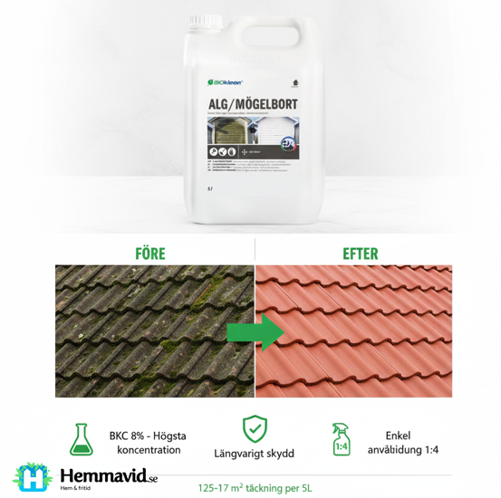 Sanerar från alger, mögel och annan påväxt. Inomhus/Utomhus