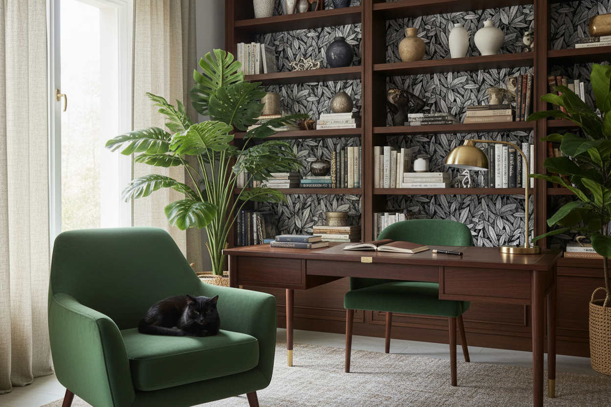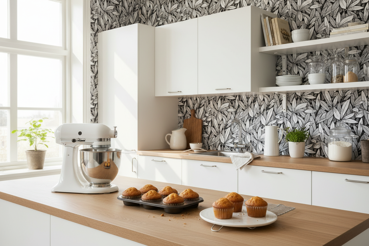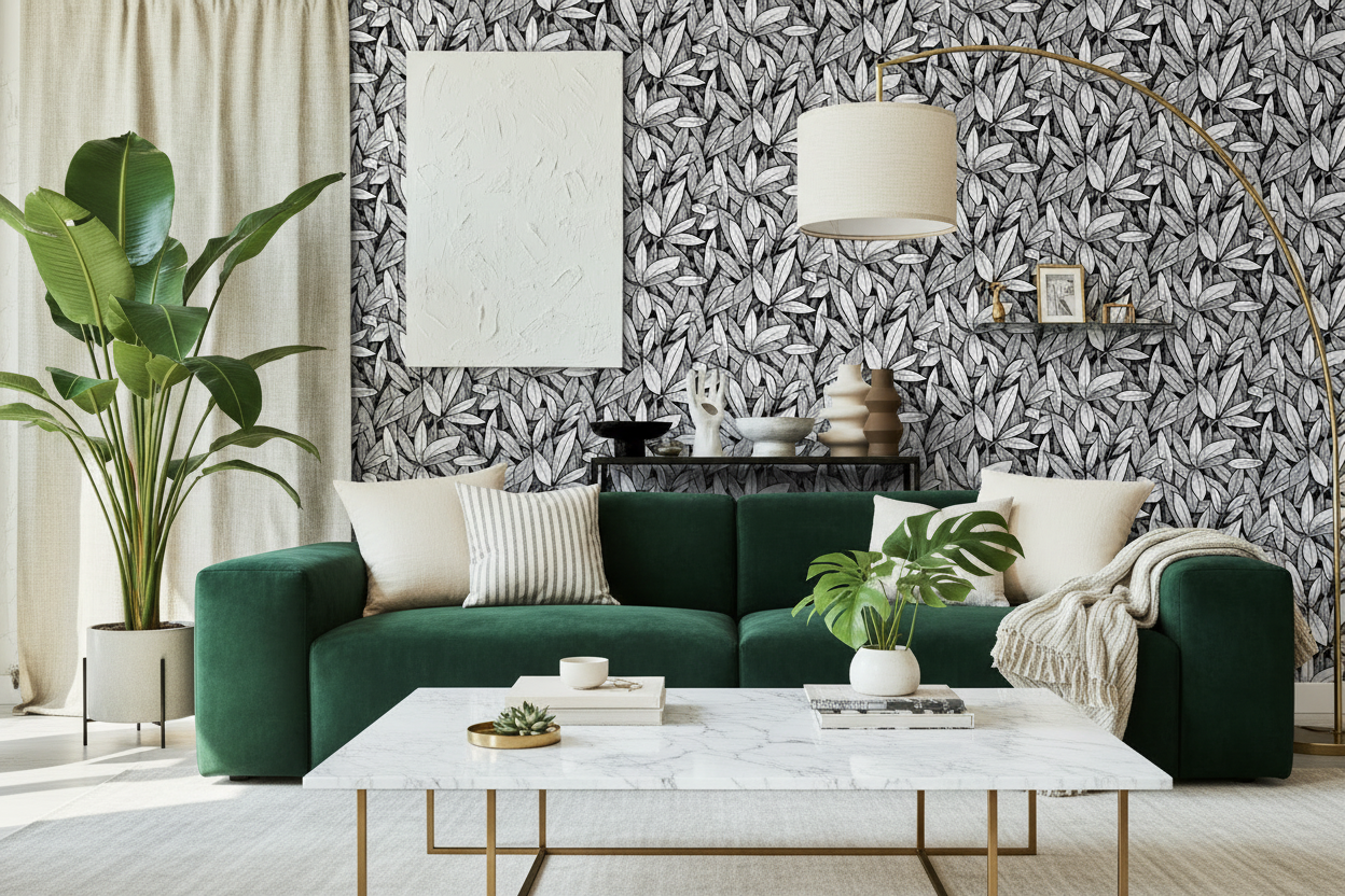 Perfekt för dig som vill skapa en bold och personlig atmosfär med stark visuell effekt. Tapeten fungerar utmärkt i vardagsrum, hemmakontor, sovrum eller kök och skapar en fantastisk bakgrund för både färgglada och neutrala inredningsstilar. Det grafiska mönstret blir extra vackert tillsammans med gröna växter som speglar tapetens botaniska tema.